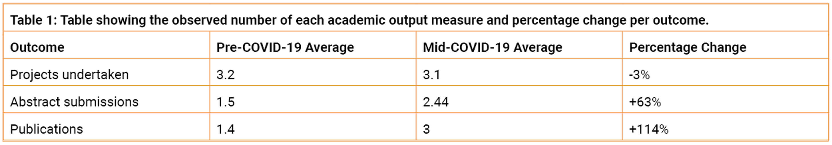 A cross-sectional study was designed and distributed to all Welsh burns & plastics trainees from specialty trainee (ST) level 3-8 including those on fellowships or time out of programme for research (OOPR) in 2021. Data was obtained comparing various measures of academic output during a pre-pandemic period, 1 March 2019 to 31 August 2019 and mid-pandemic period, 1 March 2020 to 31 August 2020.