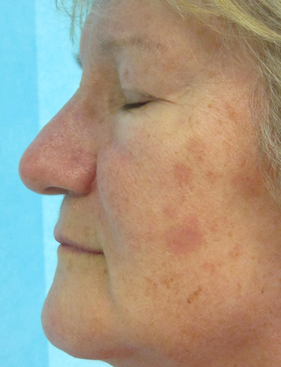 The latest version of Nebulaskin has a three-way setting for the new ‘slimjim’ hand piece to provide different levels of dermal injury. For superficial epidermal type lesions the low power setting easily removes epidermis and is ideal in treating basal cell papillomas (Figures 7a & b), for the deepest dermal ablations, such as required in rhinophyma. The highest power setting speeds up the process and avoids repeated passages. The middle setting on the ‘slimjim’ will work well on perioral wrinkles.