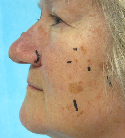 Figure 7a & b: Pre and postoperative view of a series of basal cell papillomas, easily wiped off the skin in a clean cleavage plane at the dermal-epidermal junction after superficial single pass ‘paintbrush’ treatment with Nebulaskin. There is a very superficial dermal injury and healing occurs within one week.