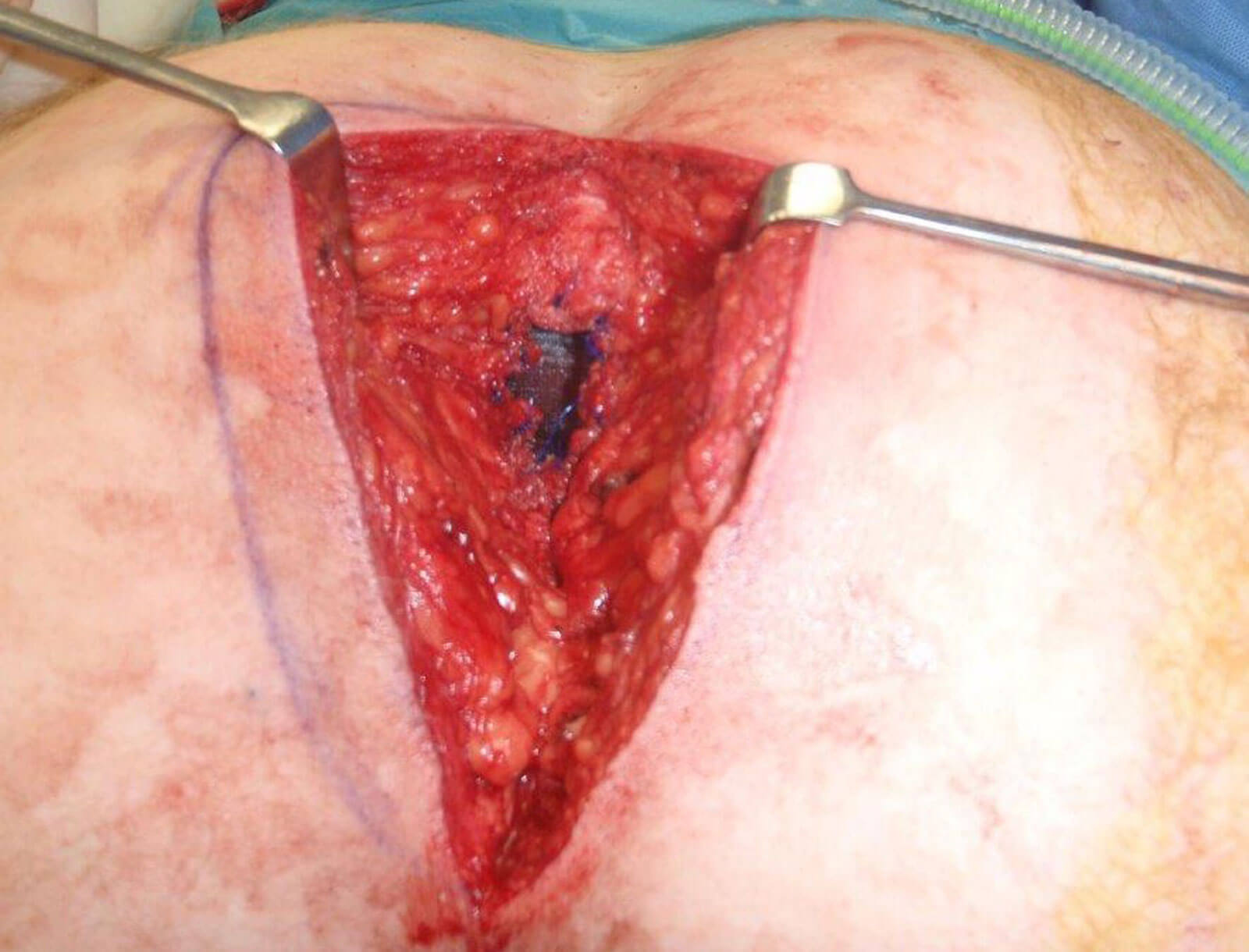 In theatre, under general anaesthesia with the patient in the prone position, the hernial sac and thinned redundant skin were excised and the small bowel was dissected free from the hernial opening, providing a ledge for the mesh to lie on. An 8cm sterile Ventralex™ self-expanding, flexible composite PTFE / polypropylene laminate mesh was easily placed and positioned with the flange abutting the internal edges of the defect, deep to the hernial defect, with the straps facilitating its intra-peritoneal placement. Fixation sutures of 2/0 prolene were used to attach the polypropylene portion of the mesh to the hernial edges and the surrounding fascial tissues were then re-approximated to further reinforce the repair (Figure 2). The adjacent skin and subcutaneous tissues were then undermined, advanced and closed in layers (Figure 3) and a suction drain left in-situ for 24 hours.