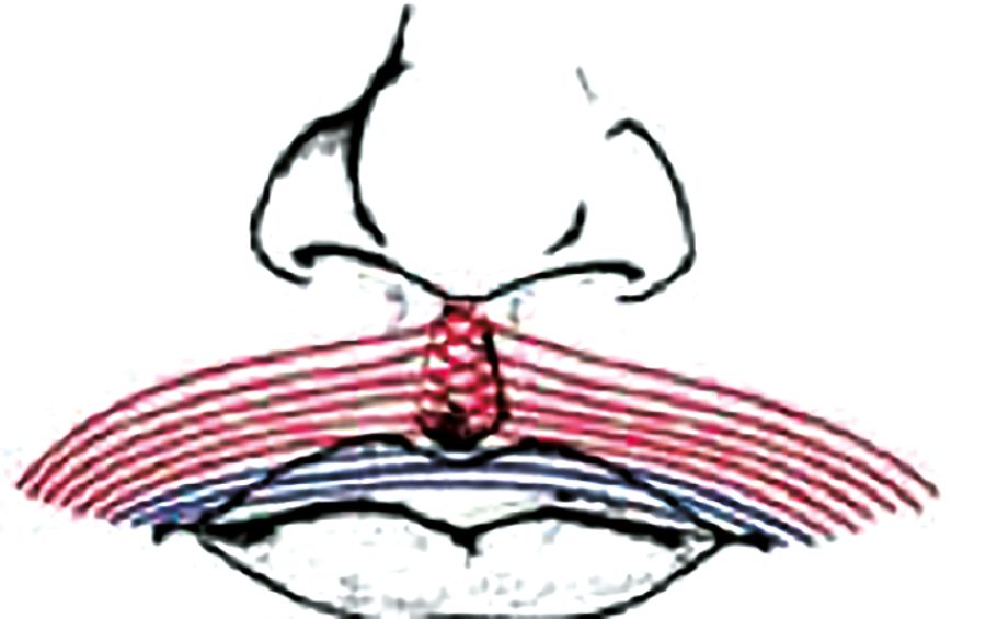 Orbicularis oris consists of two distinct parts, the pars marginalis and pars peripheralis, which differ in location and function [5]. Anatomical studies have shown that pars peripheralis fibres decussate at midline and insert into the contralateral philtral ridge, whereas pars marginalis fibres form a continuous band from modiolus to modiolus.
