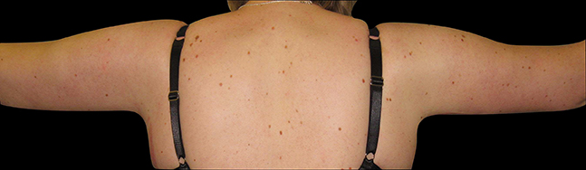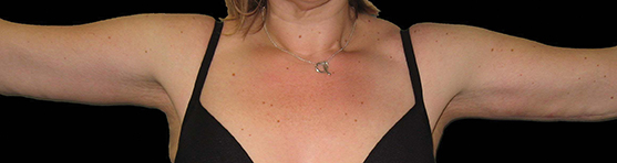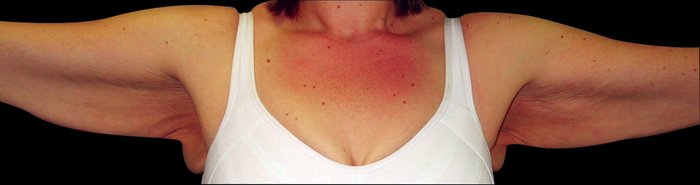 Figure 3 and 4 (pre and postoperative): This lady has had an extended arm lift to remove excess tissue in the upper arms, armpit and the sides of the chest. The scars are placed in such a way that they are difficult to visualise. Often following weight loss this is the best treatment for patients wishing to have arm rejuvenation.