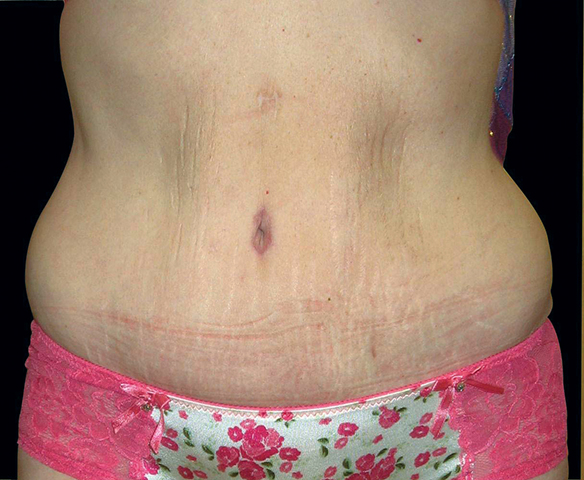 Figure 6 (pre and postoperative): This lady had extensive fat in the upper abdomen and a previous incision in the midline. In this scenario a fleur de lis abdominoplasty can help address this upper fullness and improve the abdominal contour. This is a picture taken after three months and the vertical scar will continue to fade over time. Occasionally this may be required following weight loss surgery.