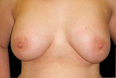 Figure 1 (pre and postoperative): Often following weight loss the volume and shape of the breast changes, making the nipple sit lower than the aesthetic ideal. Using a one-stage mastopexy implant a good result can be achieved. This result is taken at four months postoperatively and the scars have settled down well. This is often the best option for breast rejuvenation following weight loss surgery.