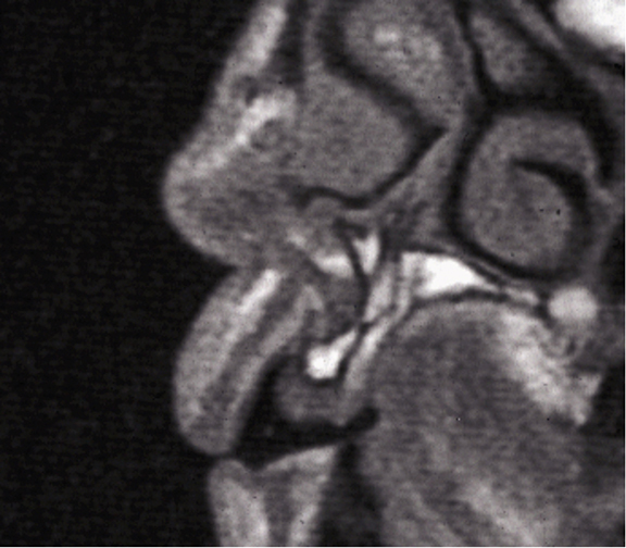 Above: A sectional MRI of the upper incisor area showing loss of horizontal bone requiring grafting.