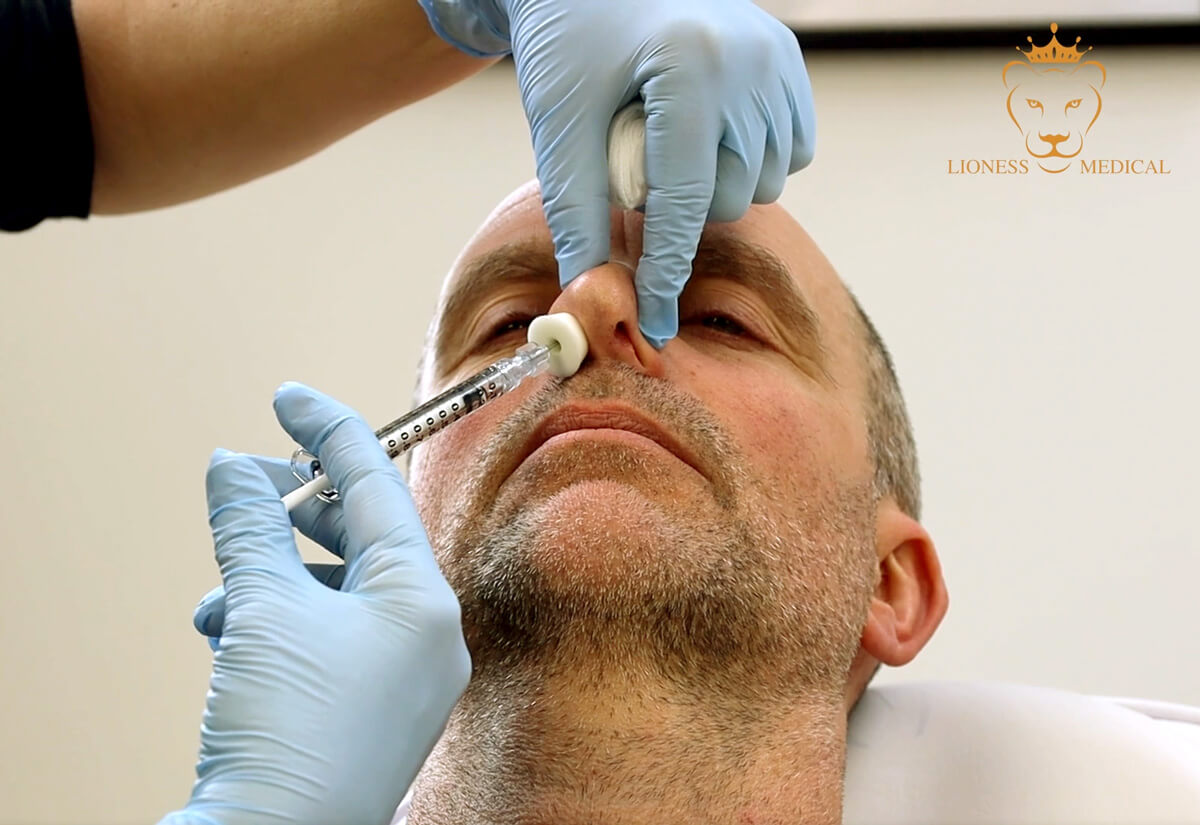 Botulinum toxin type A is reconstituted with 0.9% sodium chloride and the desired number of units are drawn up in two separate syringes, one per nostril. The bilateral transition of BTX-A via a mucosal atomisation device (nasal aerosol) into the nostrils then follows.