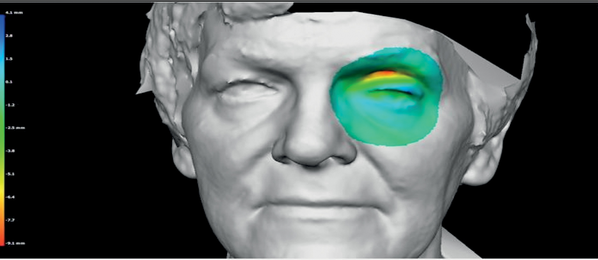 Contour map of two left periorbital images taken at different timepoints (pre and postoperative), which have been registered and overlaid to show difference in contour (warmer colours indicating deeper surface and loss of volume).