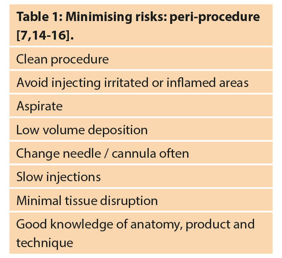 The procedure must be carried out in the cleanest possible environment. Practitioners must clean their hands, and that of their patients (as they have a habit of touching their face). Gloves must be worn. Any material placed under the skin should be injected under sterile conditions using asceptic technique [7]. The patient’s skin should be cleansed, degreased and disinfected [7]. There are several antimicrobial agents available. Hypochlorous acid solutions are gaining popularity as they are kinder to skin than alcohol-based solutions and have strong microbicidal and anti-biofilm properties [13]. Table 1 summarises ways of minimising risks during a procedure.