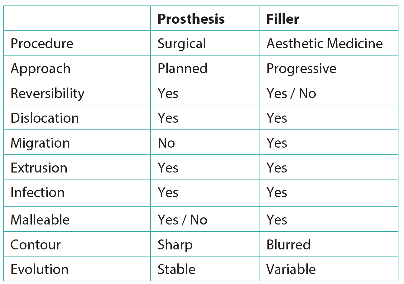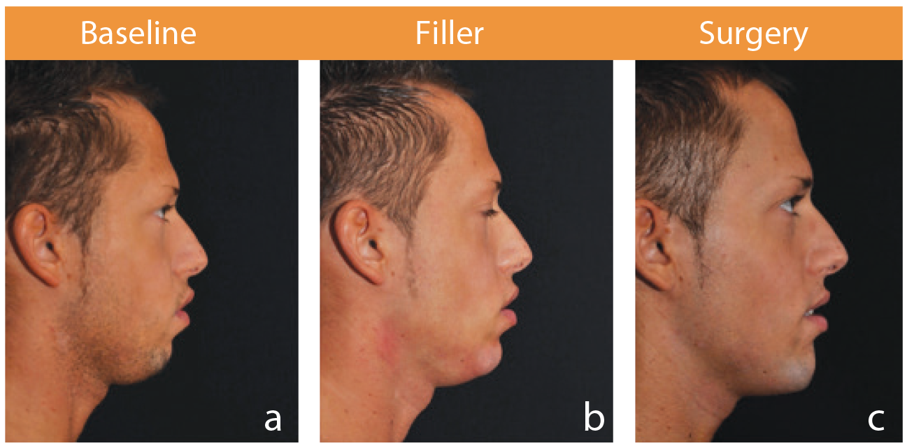 Another method of chin augmentation uses an injectable implant (filler). Most fillers are temporary with results lasting months to years. Common temporary fillers include hyaluronic acid and calcium hydroxyapatite preparations. Permanent fillers, like ‘free’ silicone, have fallen out of favour due to the risk of migration, chronic inflammation and infection, which can permanently disfigure the chin.