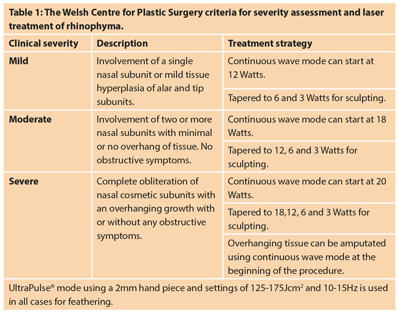 The Welsh Centre for Plastic Surgery criteria for severity assessment and laser treatment of rhinophyma.