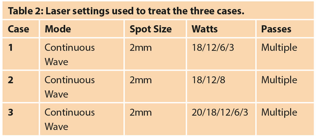 As the bulk is reduced it is important to progressively lower the energy to maintain control and minimise the potential of over-reduction and scarring. This usually follows a pattern of 8 watts, 6 watts and 3 Watts until a satisfactory end point is achieved (Table 1). Finally, the CO2 laser is changed to the UltraPulse® mode. Using a 2mm hand piece and settings of 125-175 Jcm2 and 10-15 Hz, finer shaping, ‘feathering in’ and blending of treated areas into normal surrounding tissue is achieved. The patient is given a mirror prior to concluding the treatment to ensure the outcome of the ablation is satisfactory.