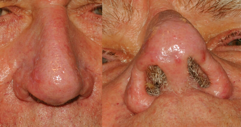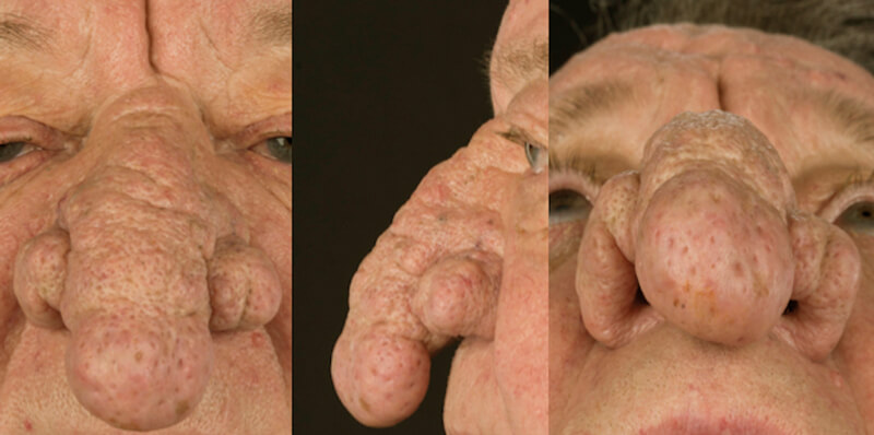Rhinophyma, a severe form of chronic rosacea, is a benign proliferative disorder of the nose almost exclusively affecting Caucasian men [1]. Although its pathogenesis is still not completely understood, clinical manifestations include erythema and enlargement of the nose with tumour-like growths due to sebaceous and connective tissue hypertrophy [1].