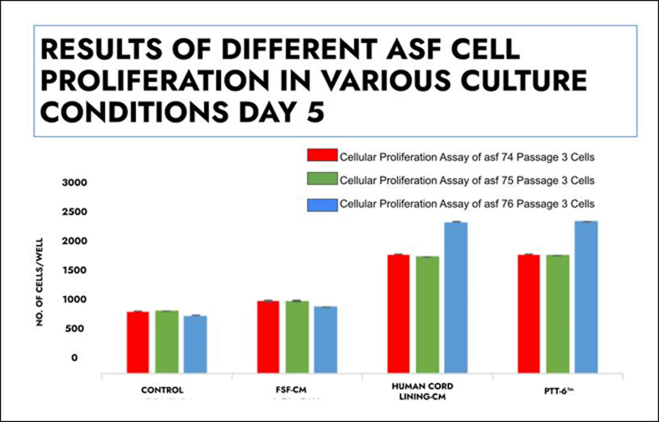 Figure 1: Cell proliferation assay of adult skin fibroblasts 74, 75 and 76 Passage 3 cells in different culture conditions on day five, demonstrating similar levels of proliferation in fibroblasts exposed to human and red deer (PTT-6) UCL-MSC exosomal proteins in conditioned media.