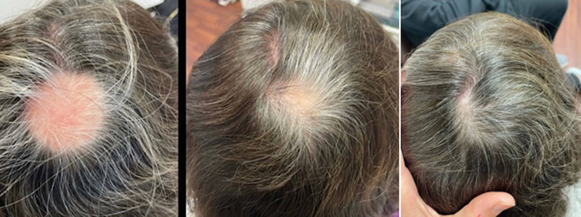 Figure 5: Alopecia areata treated with weekly micro needling sessions and application of red deer UCL-MSC exosomal proteins for six weeks. Images were taken pre-treatment, six sessions and four months later, and eight sessions and eight months later. Courtesy of Ms Kelly Morrell, London.