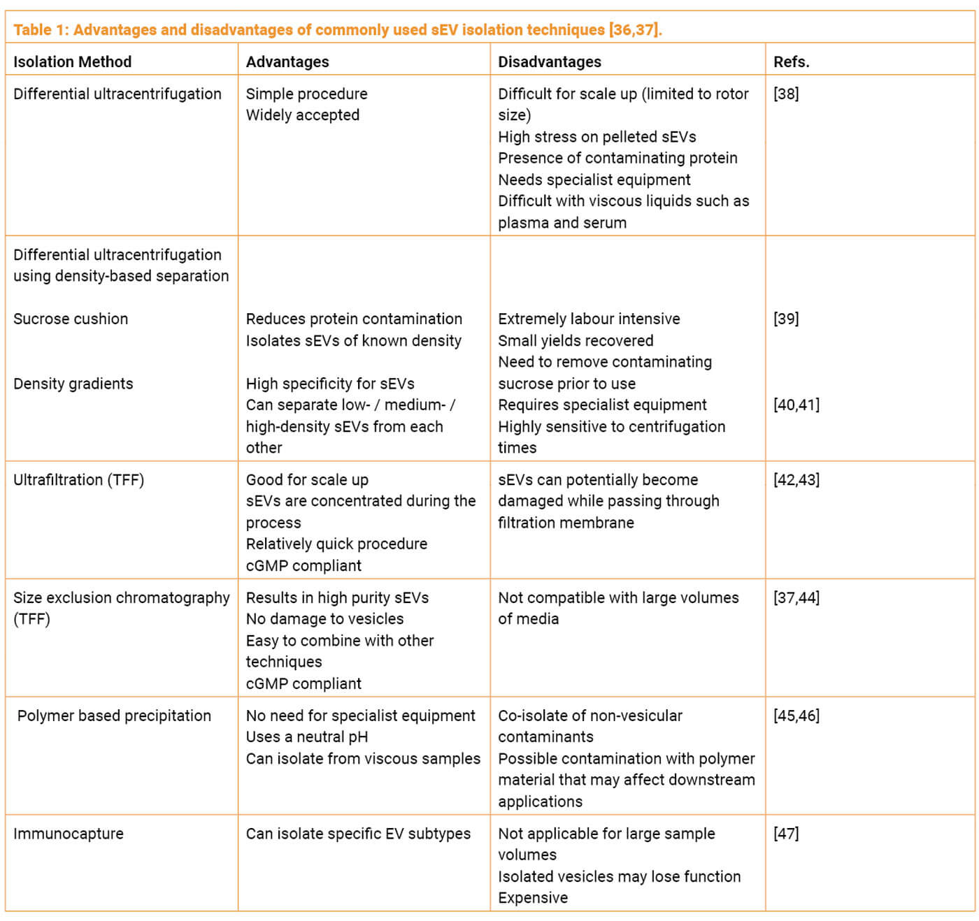 There are also numerous other methods each with their distinct advantages and disadvantages summarised in Table 1. Additional methods of purification that involve combining multiple techniques have demonstrated a superior outcome in terms of yield and purity. A common approach that is also cGMP compliant, is combining tangential flow filtration (TFF) and size exclusion chromatography (SEC). TFF with a molecular weight cut off Of 100KDa or lower can be used to concentrate vesicles from the starting conditioned medium. TFF is scalable to large volumes and allows a smaller volume of media to be loaded onto a SEC column to purify sEVs from other soluble proteins.