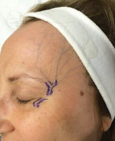 Figure 6: Forehead veins, bulging and too deep to see any colour. Suitable for phlebectomy under local anaesthetic, a far more complicated procedure than phlebectomy elsewhere on the body due to the muscles of facial expression inserting into the skin.