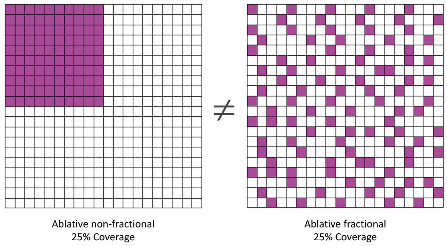 Figure 1: Graphical representation to illustrate the concept of conventional, confluent (left) vs. fractional laser treatments (right). The purple zones indicate the thermally damaged areas. Although in both cases, the same total area is covered by the laser treatment (25%), the treatment outcome is expected to be markedly different. The non-fractional laser treatment (left) causes bulk heating and results in the formation of fibrosis and potentially a scar. Fractional photothermolysis (right) with the same laser settings, but using a pattern leaving intervening unaffected tissue in between, reduces side-effects and induces wound healing without formation of scarring and fibrosis.