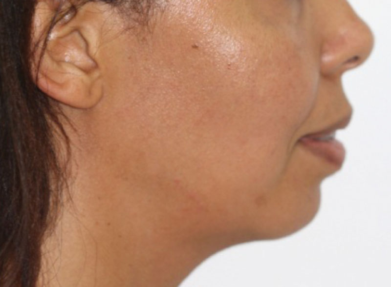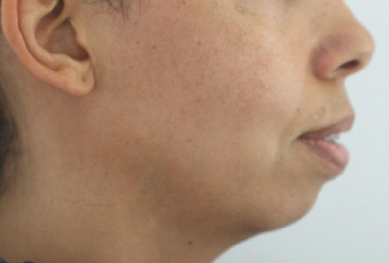 Figure 2: Post-op advancement osseous genioplasty of over a centimetre in projection and increase in lower facial height. A chin implant would have never achieved this advancement, contour accuracy or harmony, nor would it have achieved the increased neck chin sharpness the osseous genioplasty can achieve. This is still a compromised outcome, but with patient consent.