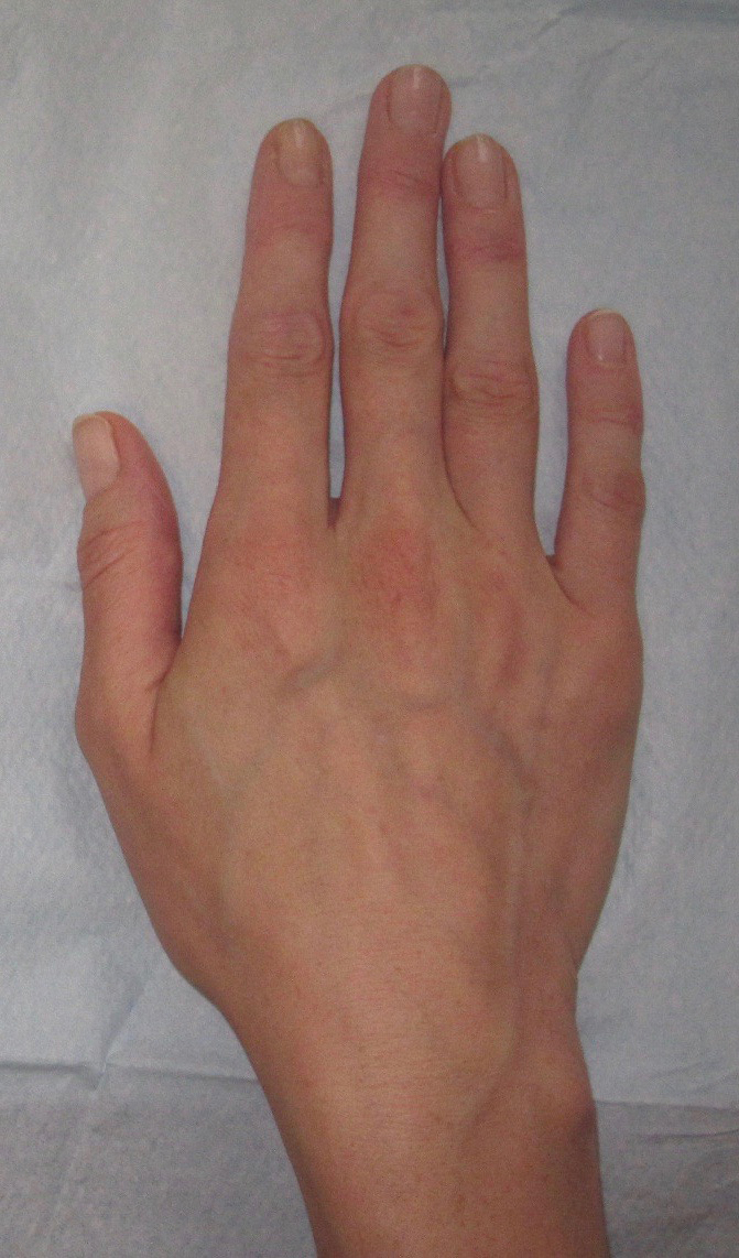 The extensor tendons are located between the dorsal intermediate fascia and the dorsal deep fascia. There is potential communication between the palmar and dorsal vessels through perforators, which pass through the interosseous spaces, which lead to the end arteries in the digits. There is potential for material injected in the dorsum to pass by a retrograde mechanism into the palmar circulation and enter the end artery of the digits. An assessment of the motor and sensory activity of the palmar region of the median, radial and ulnar nerves, should be performed. In addition, the arterial supply should also be assessed by utilising the Allen test.