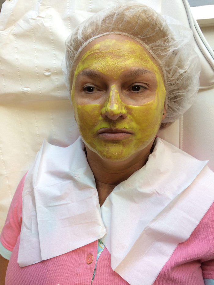 The mask is left on for approximately 20 minutes or until dry, then starting at the edges, gently peel off. The bright colour of the mask is useful in ensuring that none is left behind on the skin that might lead to over-treating.