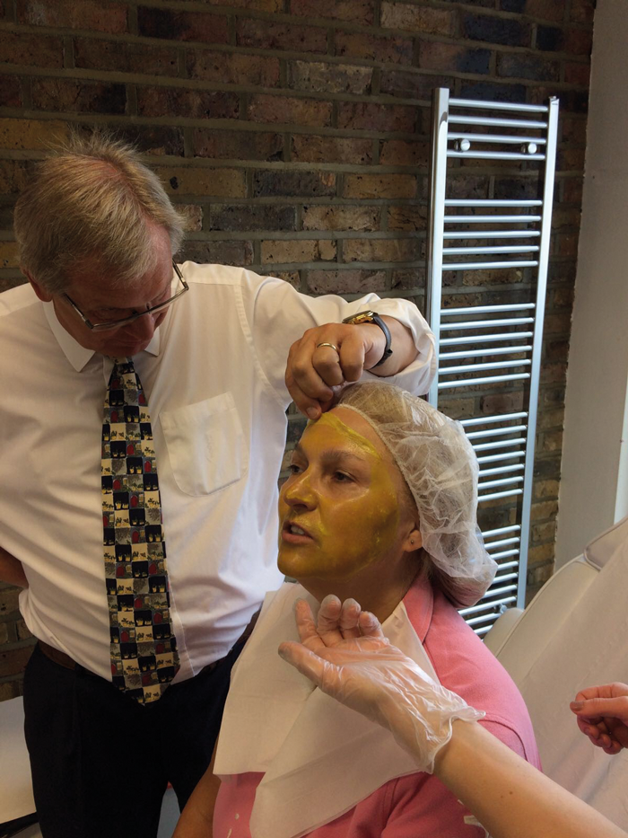 We clean the skin first with a gentle cleanser and have found that the mask is easiest to apply with gloved fingertips. When applying to the patient’s face, start from the centre and work outwards, always avoiding the mucus membranes and the hairline. Although the 10% polyvinyl component of the mask makes it very easy to remove, it will also remove hair if applied over it.