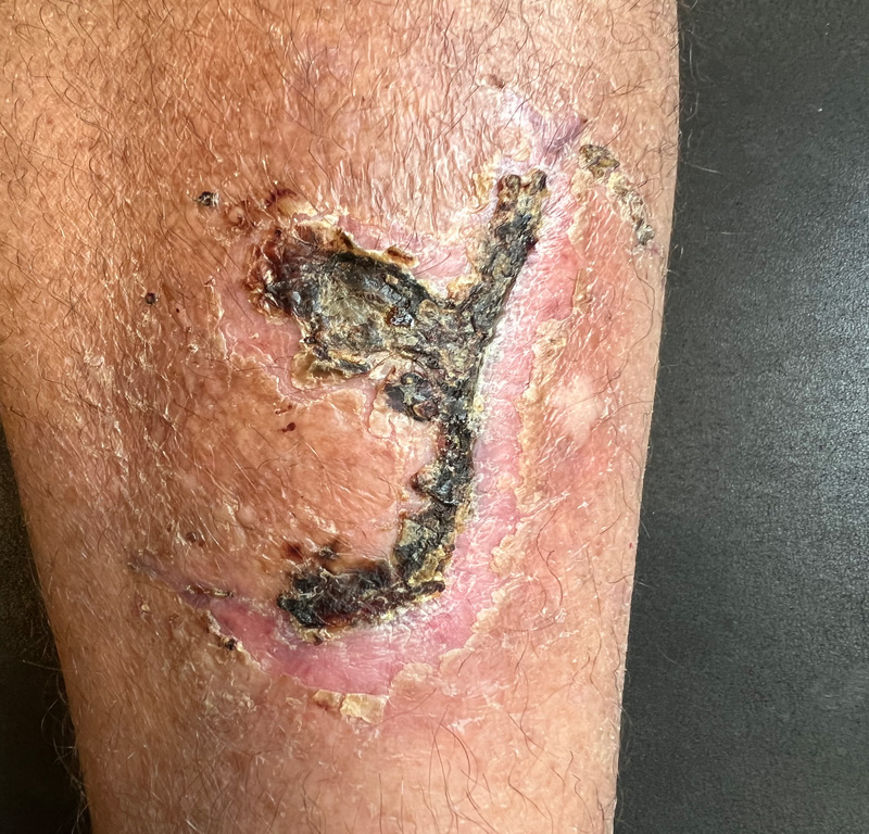 Figure 1: The initial wound on the left anterior shin presenting four days after injury. The wound has advancing cellulitis and shows full thickness skin necrosis and an inflamed / infected wound line. After surface cleaning and superficial debridement, the wound was treated with fESWT. This continued twice weekly until healed.