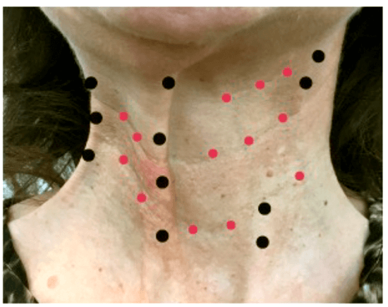 The patients were treated with two interventions in the first session, as follows: 2ml of hyaluronic acid stable hybrid cooperative complexes of high and low molecular weight for restoring skin laxity was injected into the recently developed Neck Bio-Aesthetic Points (10-point injections of 0.2ml) (Figure 1).