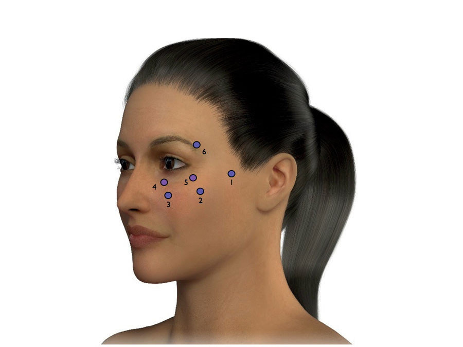 - Malar groove - to correct depression and promote anterior projection and vertical lift of the medial cheek. This point also improves the tear trough indirectly through volumetry of the SOOF.