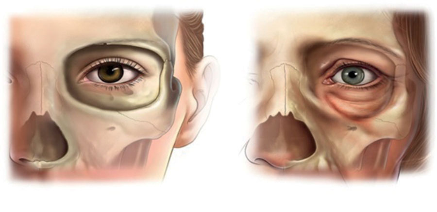 - Anterior herniation of the infraorbital fat into the lower eyelid and held by the orbicularis retaining ligament. This leads to the appearance of ‘eye bags’ and deterioration of the tear trough deformity.