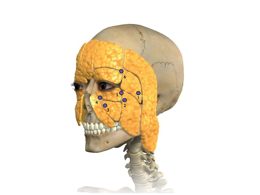 - Temporal fossa - volumetric correction under the deep temporal fascia gives supero-lateral lift to the tail of the eyebrow.