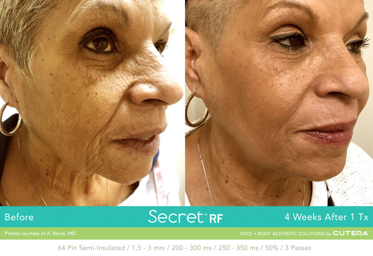 Secret RF is safe for treating darker skin types with the semi-insulated needles treating darker skin very well. It also has a unique advantage over lasers when working around the eye, where photodamage from lasers to ocular structures is a risk. Because the RF energy can be targeted precisely to the level where treatment is needed, collateral damage to the dermo-epidermal junction can be avoided, allowing for higher energies to be directed to the predetermined depth.