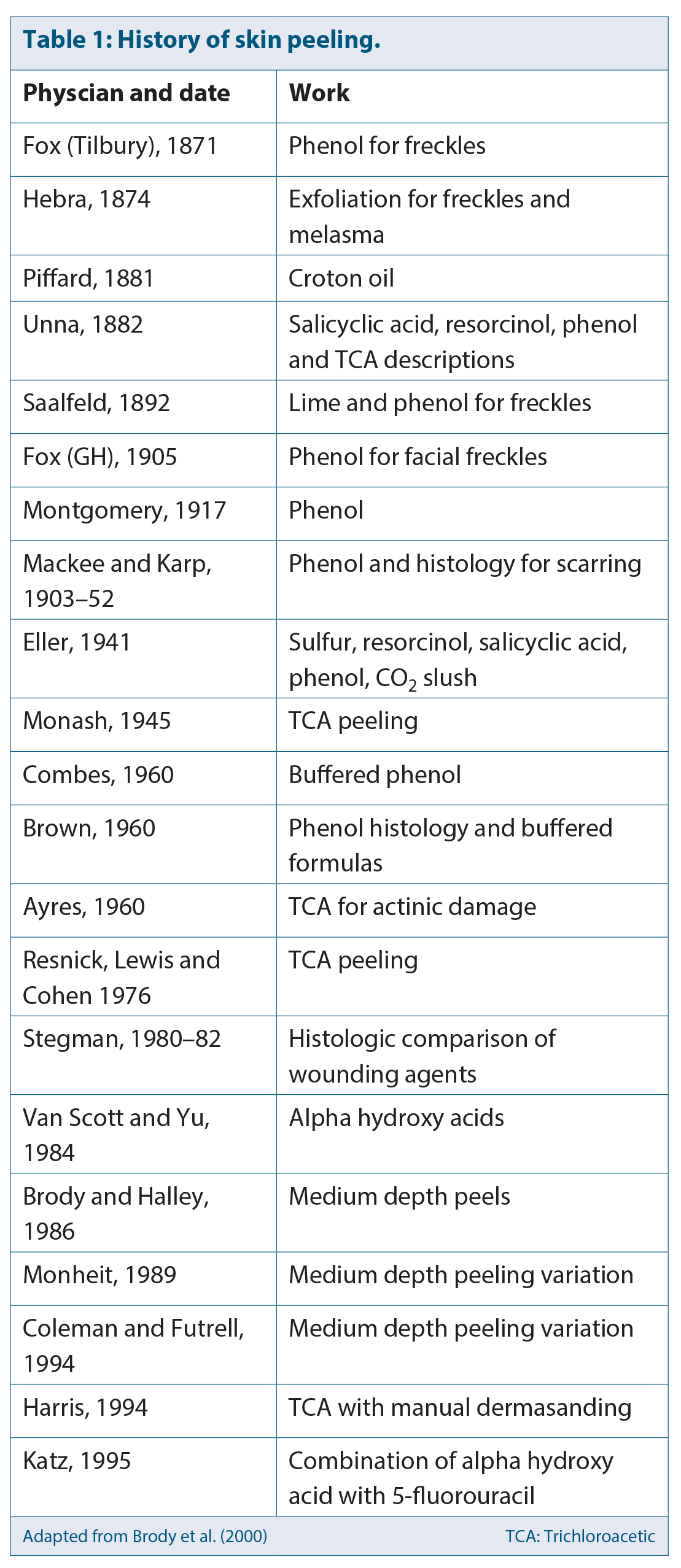 There was a flurry of clinical research and interest in phenol in the late 1940s, and trichloroacetic acid (TCA) in the 1960s, but it was not until the late 1970s and 1980s that chemical peeling regained popularity. During this time, Resnik et al. [1] published articles on the benefits of TCA and Van Scott and Yu published papers on alpha hydroxy acids (AHAs) (Table 1 [2]).