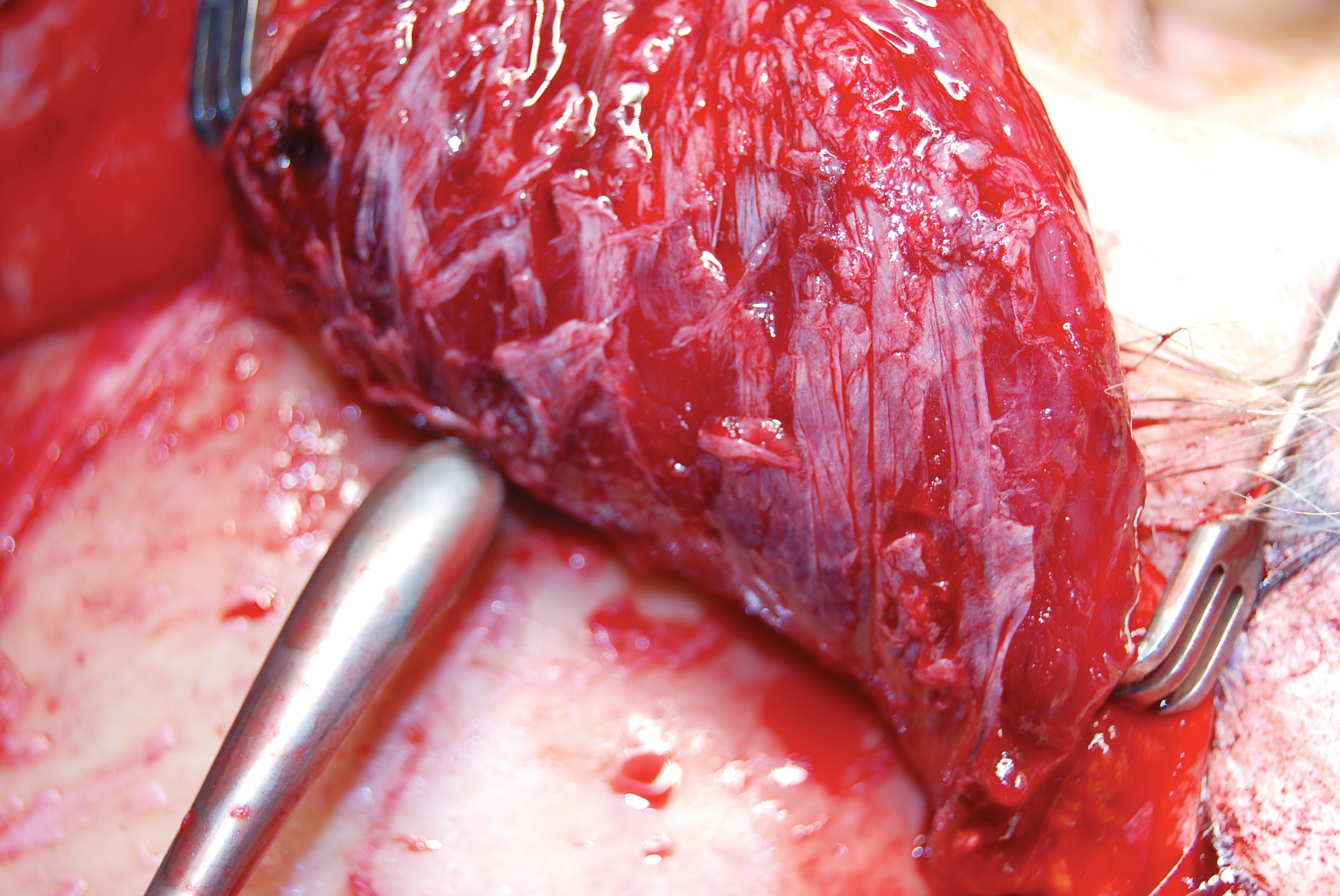 - The posterior fibres of the temporalis muscle are reattached to the cuff of deep temporal fascia in a more anterior position, with 2/0 polydioxanone suture (PDS).