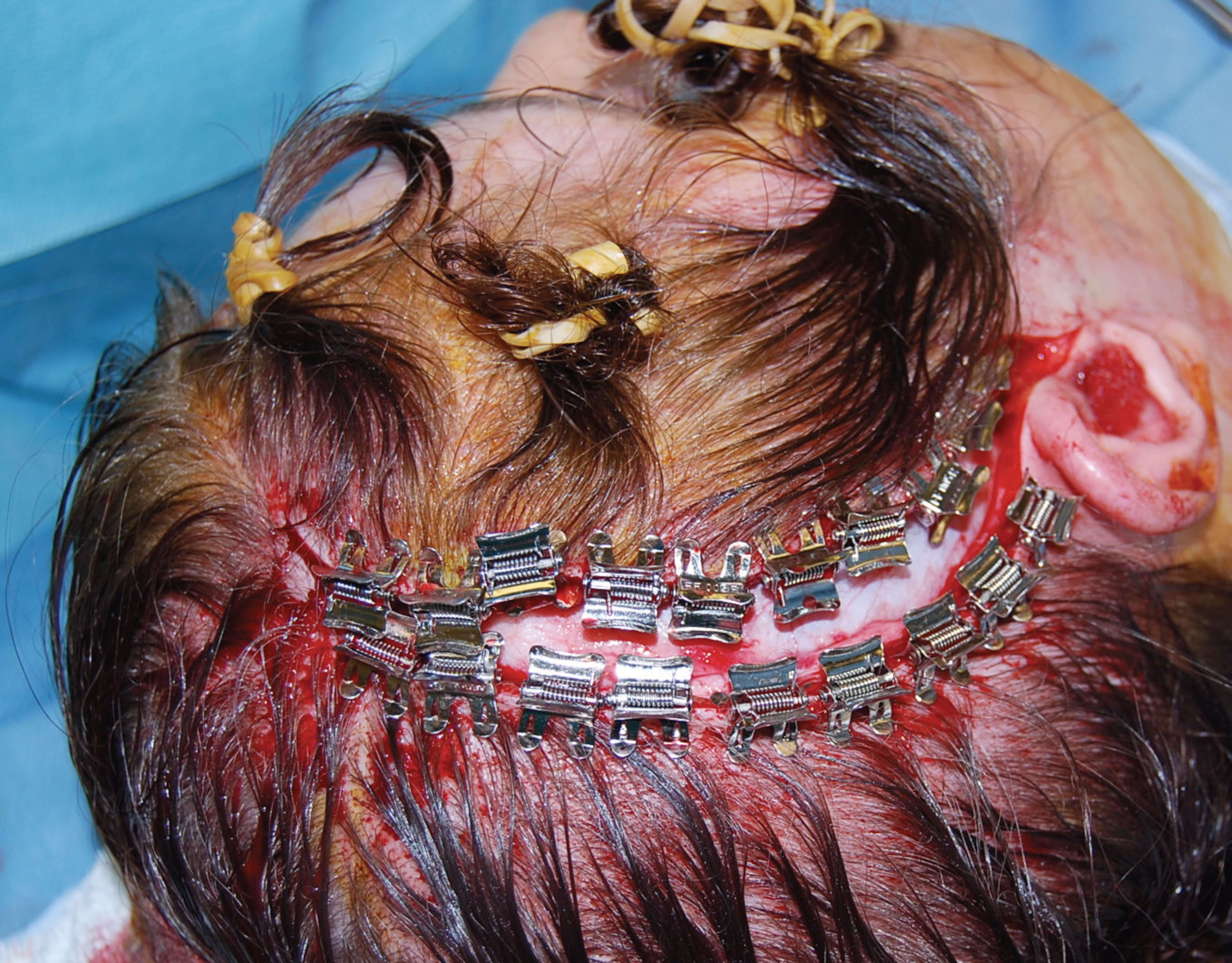 - Cologne scalp clips are applied for scalp edge haemostasis (Figure 2).