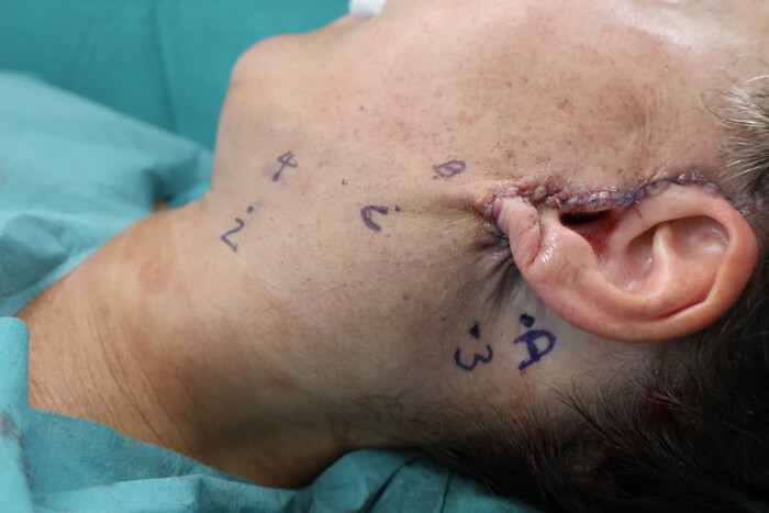 This involves using the suture remnant on the same rod delivery system after usage for the neck defining suture. The suture is placed subcutaneously from over the mastoid process to two small puncture wounds vertically aligned to the position for elevation (Figures 3 and 4).