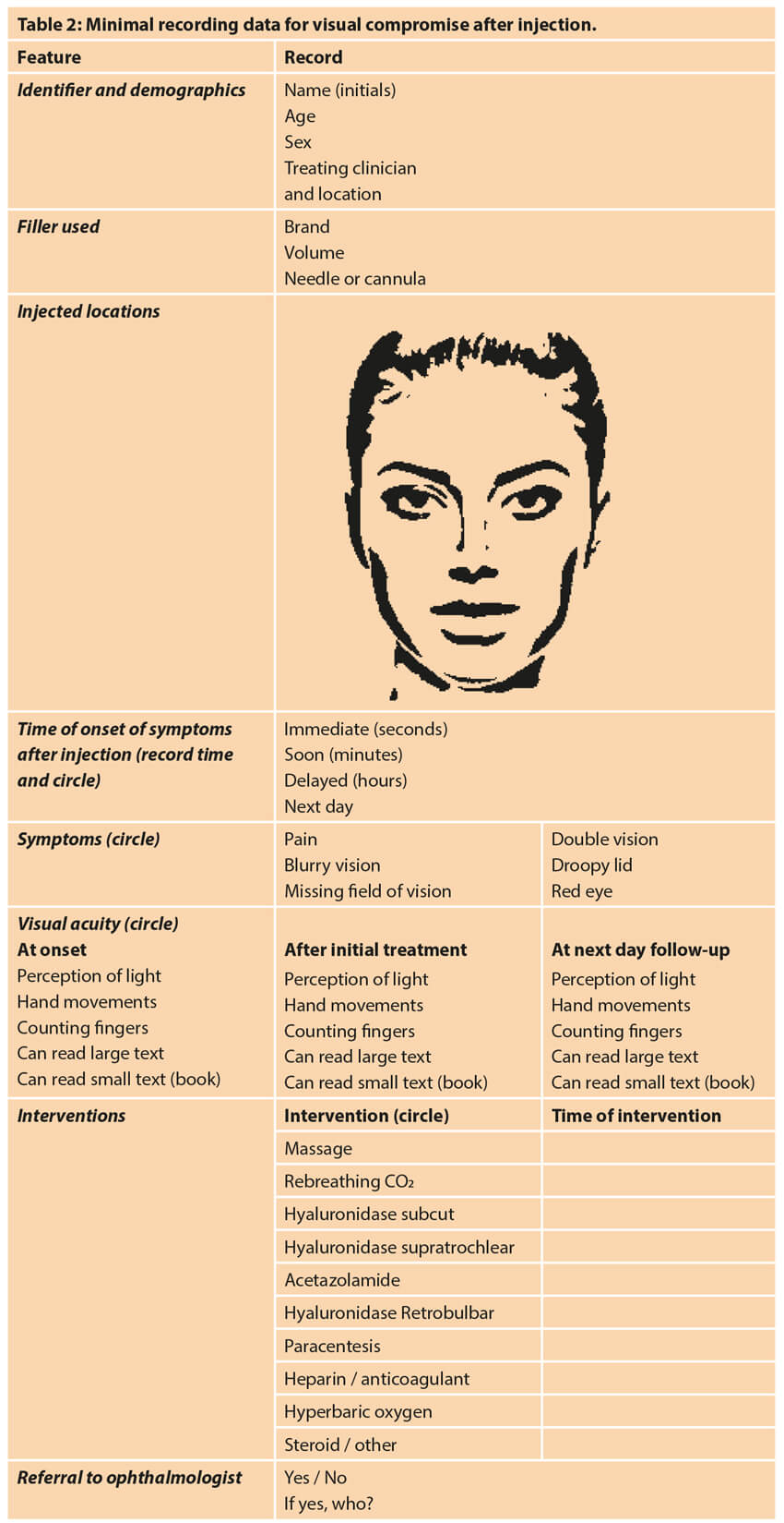 Only with further data will our understanding improve. We therefore urge any practitioner who comes across visual disturbance post filler, to aid research and consider completing the minimal dataset shown in Table 2. This should be transmitted without patient identifiable details to research@facerestoration.com where it will be handled in the strictest confidence. The data will be collated and transmitted to reciprocal oculoplastic surgery societies for future publication, and all contributors will be added to the author list. It is also recommended that the Medicines and Healthcare products Regulatory Agency (MHR) is informed through the Yellow Card System.