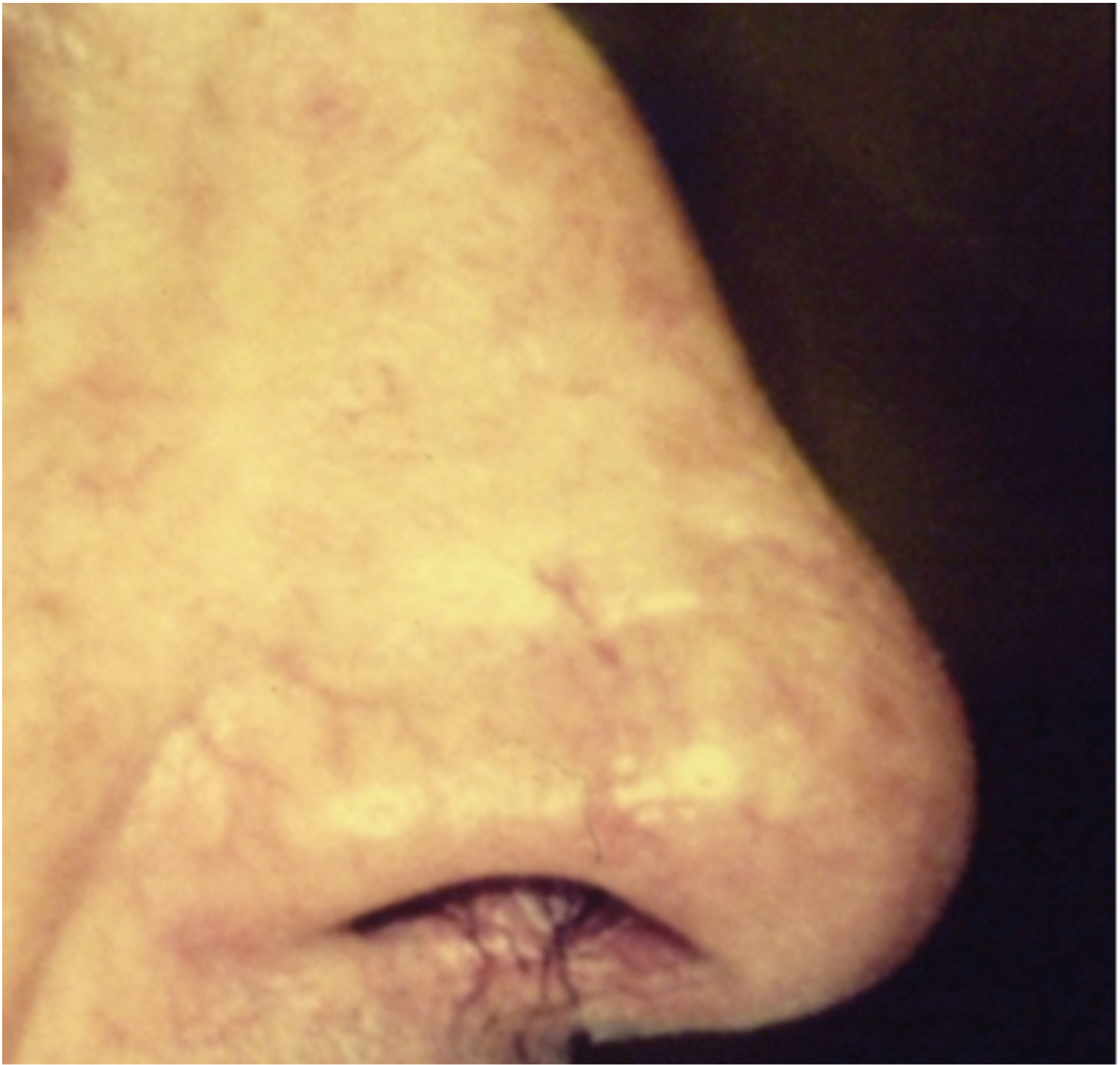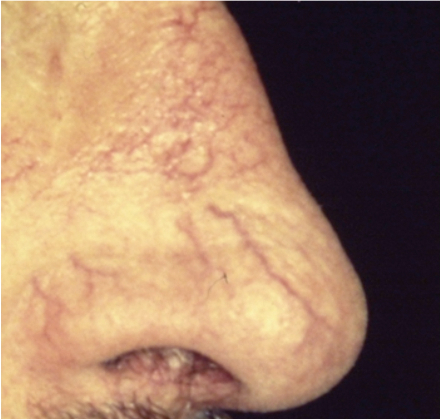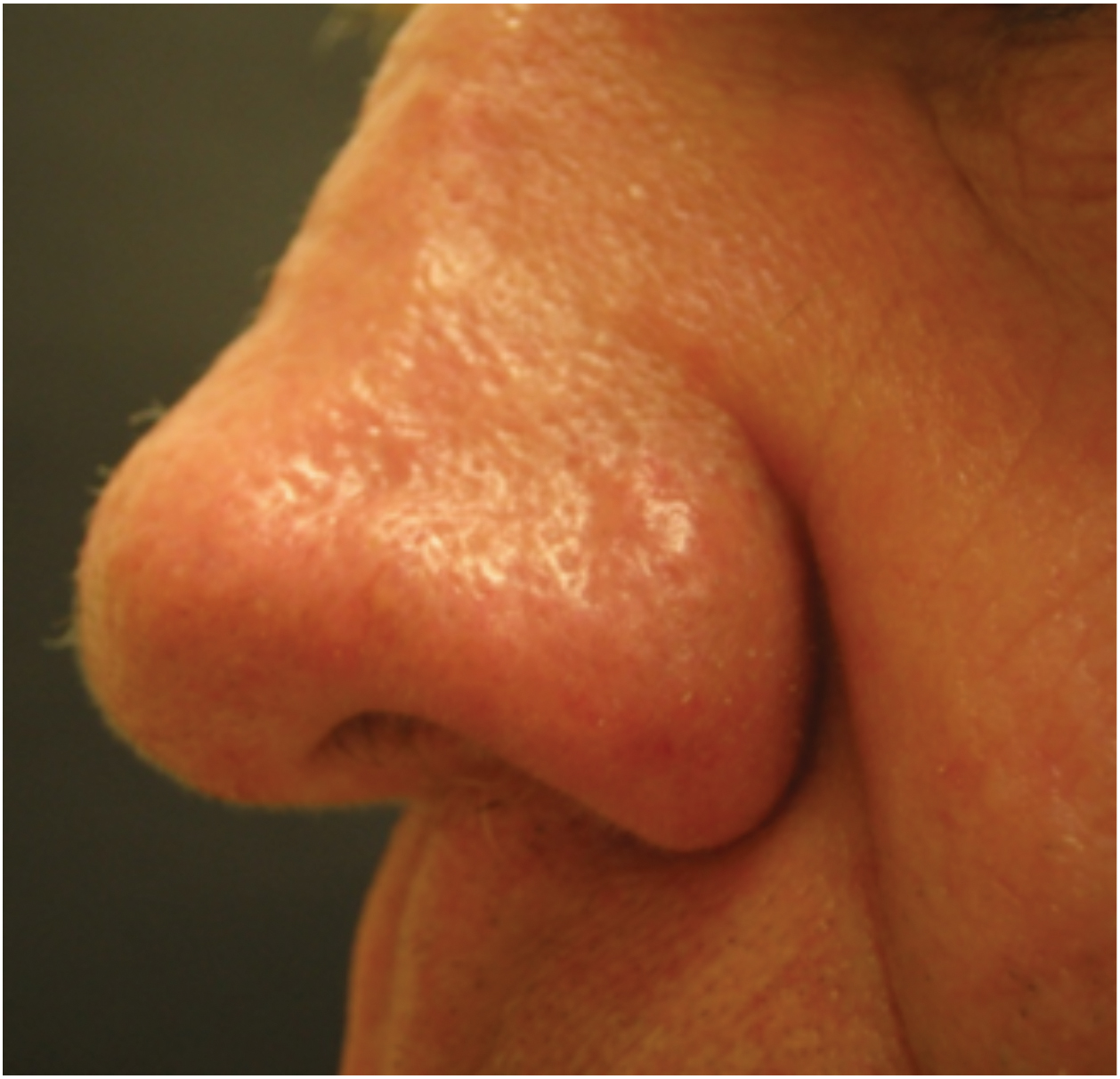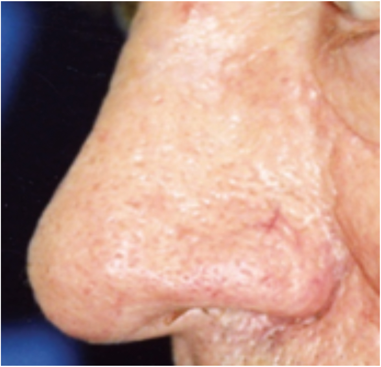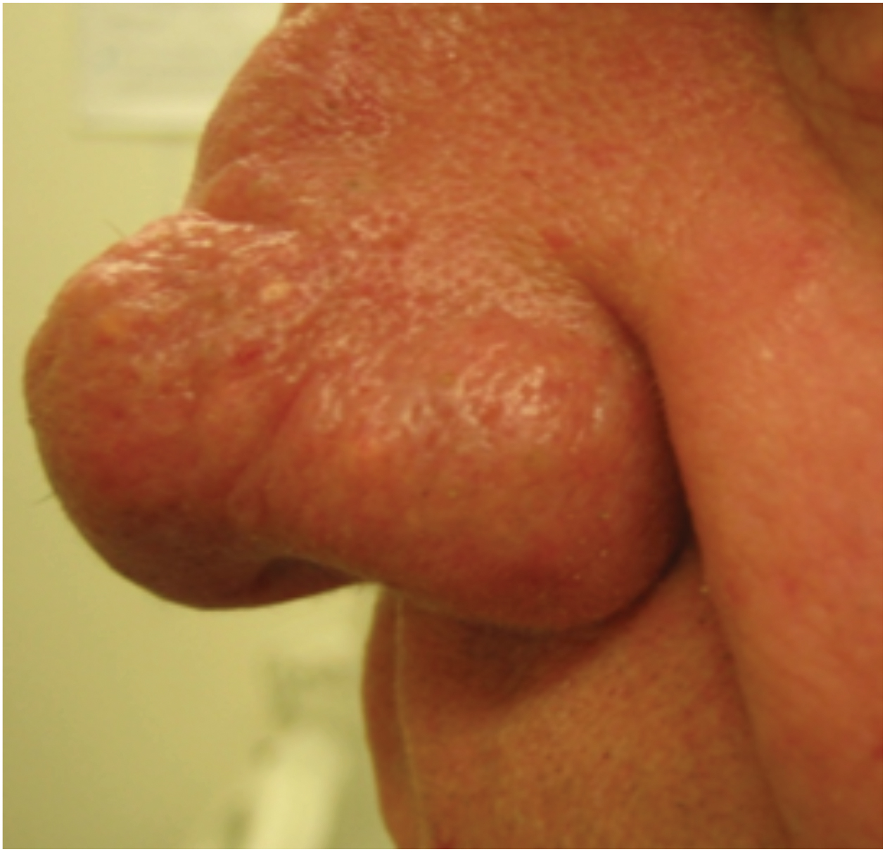 Rhinophyma is a slowly progressive, disfiguring disorder of the nose which represents the end stage of acne rosacea. The cosmetic deformity is often the reason for patients to seek medical attention. Ablative lasers can be used for incisional surgery and have the advantage of non-contact with the skin, haemostasis, reduced postoperative pain and sealing of lymphatic channels.
