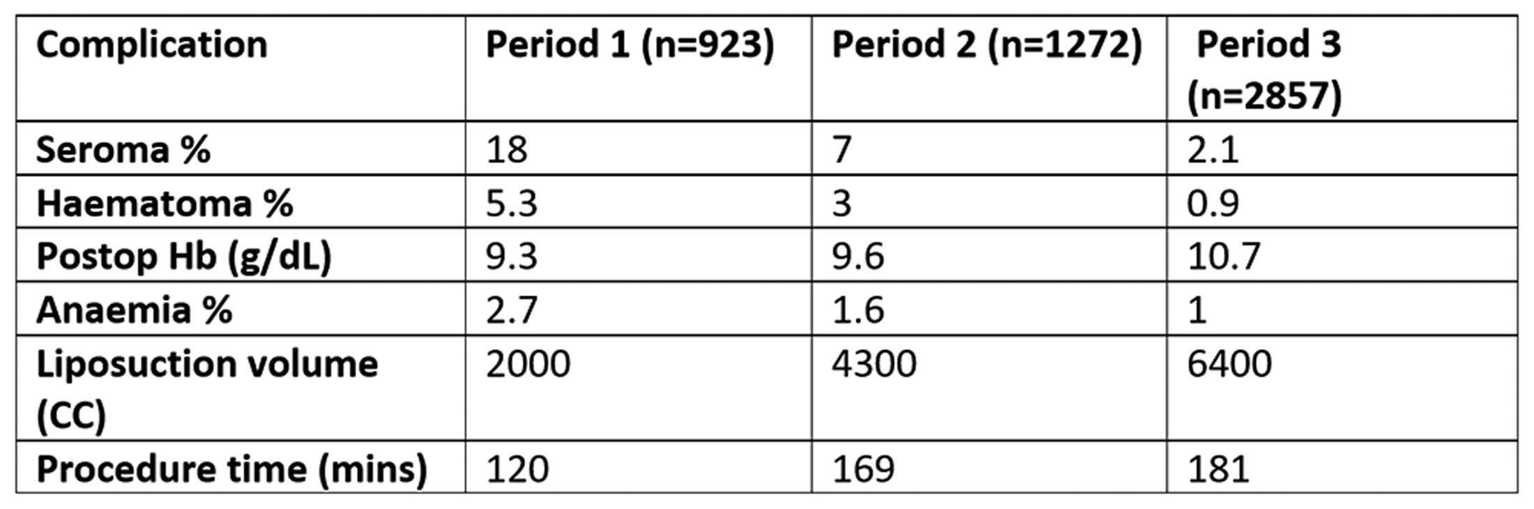 The paper also explains adjuncts that have been introduced in an effort to reduce complications, namely pre and intraoperative warming and tranexamic acid. Comprehensive analysis of postoperative outcomes shows that these have had a positive impact as demonstrated in this table. The trend being to a greater volume of aspirate with an overall lower complication rate.