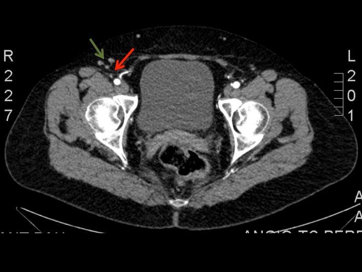 Figure 1: Axial view of CT-angiography showing the right superficial inguinal lymph nodes (green arrows) and the nourishing superficial circumflex iliac vessels (red arrows). This helps to locate the lymph nodes to be harvested and its nourishing vessels, using a combination of coordinates in a system of cartesian axis.