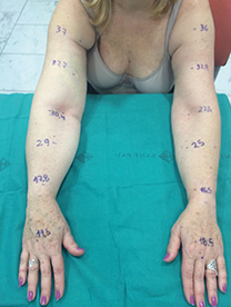 Liposuction today is performed using power-assisted liposuction as the vibrating cannula facilitates the process. We use a tourniquet to minimise blood loss. Liposuction is carried out following the technique described by Brorson [4]. This type of liposuction is performed circumferentially, step by step, from wrist to shoulder, and the hypertrophied fat is removed as completely as possible. We use 15 and 25cm long cannulas with diameters of 3 and 4mm.