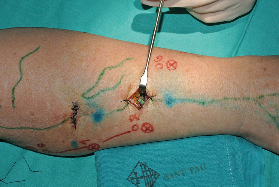 We start performing the LVA at the locations where prominent lymphatic vessels appear, always considering first the most proximal ones. Thus, if the anastomosis is feasible, we will be able to recruit a greater volume of lymph from the distal part of the limb. Most functioning lymphatics are found in the wrist and in the distal two thirds of the arm as the proximal lymphatics are normally damaged first.