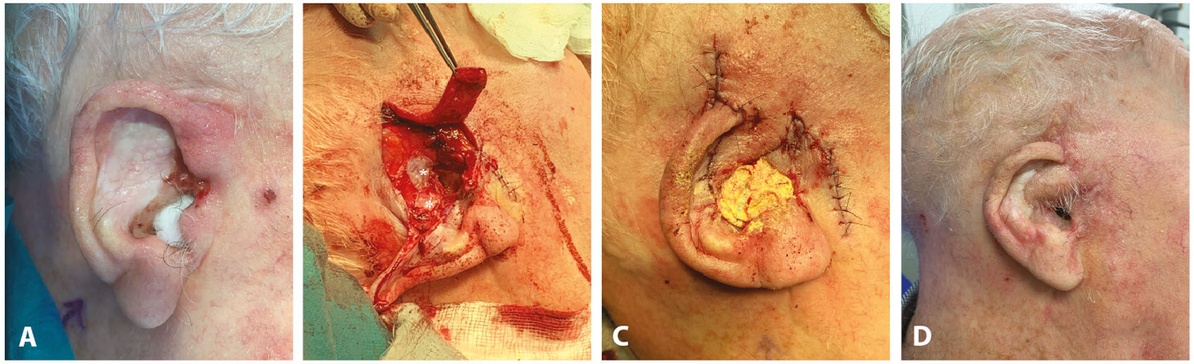 Figure 2A) Interoperative picture demonstrating concha bowl recurrent infiltrative BCC. B) Intraoperative picture following excision with pre-auricular flap used for reconstruction and temporalisfascia grafts (astrix) to line the exposed external auditoty canal. C) Immediate postoperative result. D) Postop result at 12 weeks.