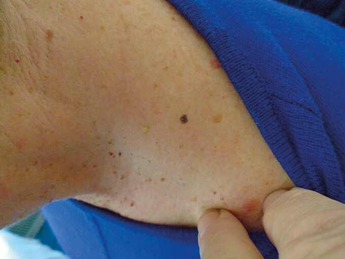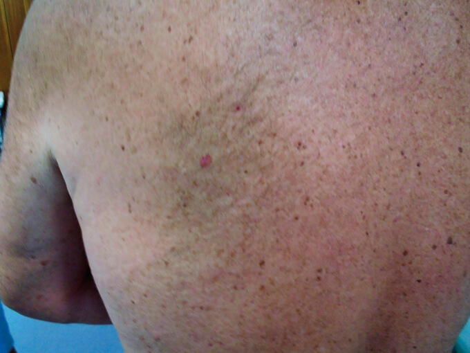 Subtle pink and brown melanoma picked up on a routine skin check.