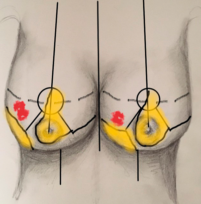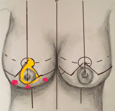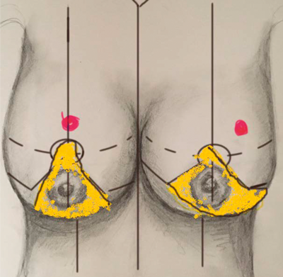 Figure 1. Standard markings for Wise pattern bilateral breast reduction and an example of using supero-medial pedicle when breast cancer is located within the areas of Wise pattern breast reduction excision.