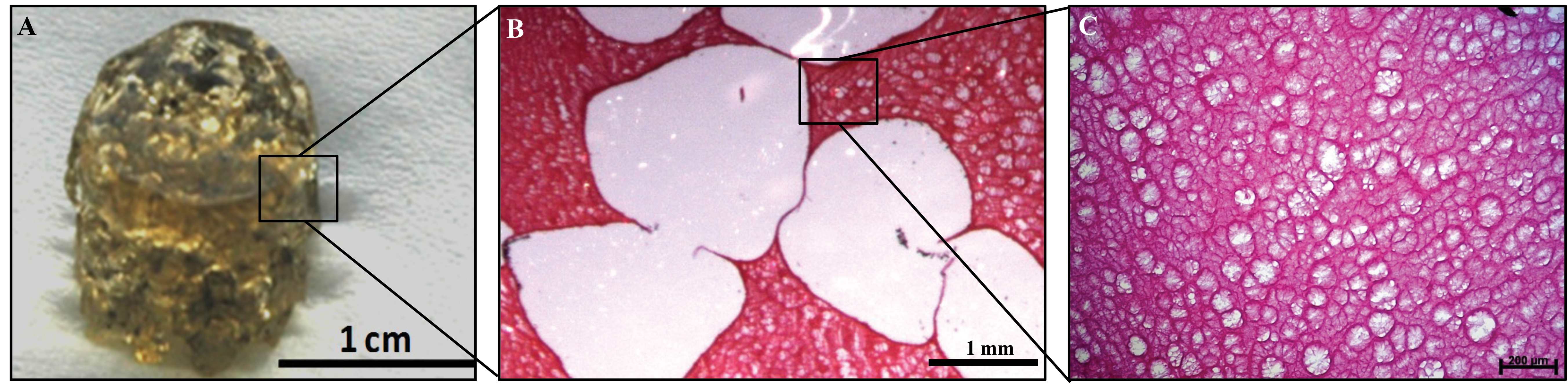 Figure 3: Microporous-macroporous scaffold for adipose tissue reconstruction. (A) The gelatin sponge previously developed by our group contains both macropores and micropores [3]. (B) The macropores were created by leaching of alginate beads from a gelatin matrix, providing sufficient space for cells to attach, proliferate and differentiate. (C) The micropores were created by a cross-linking process within the gelatin, allowing cell and nutrient infiltration as well as waste removal. Scale bars as indicated.