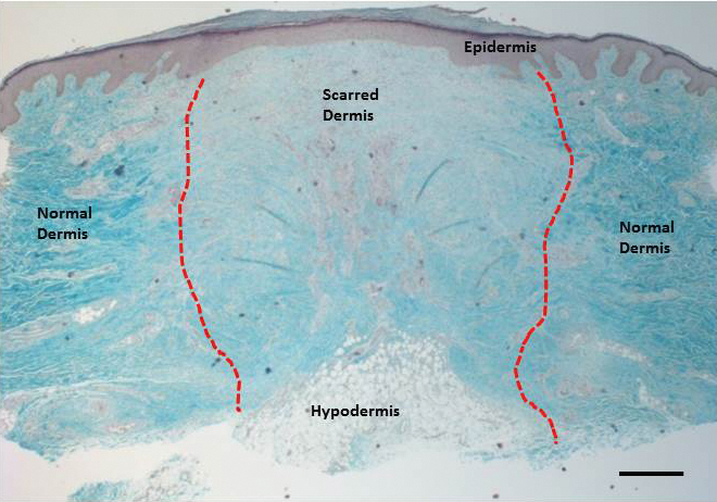 Figure 1: Histological section through a scar showing the thjree main layers of the skin. This Masson’s Trichrome stain depicts the three main layers of the skin - the epidermis, the dermis and the hypodermis. The blue staining highlights the collagen structure of the skin with the reddish purple staining showing epithelial, keratin and cellular stuctures. The hypodermis consists of subcutaneous adipose tissue with lipid accumulating round adipocytes (fat cells). The red dotted line shows the boundary between the dermal scar and normal dermis. Scale bar is 100μm.