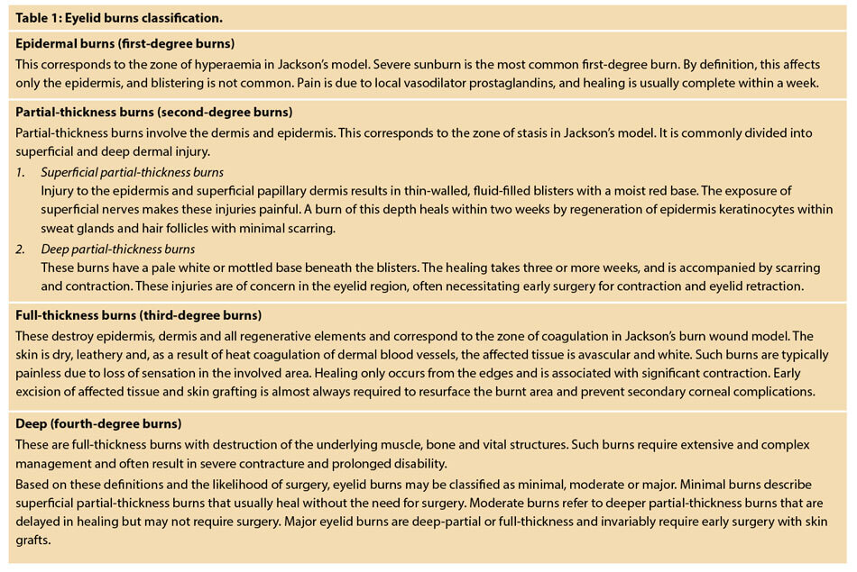 Eyelid burns are classified depending on how deep and severe they penetrate the skin’s surface (Table 1).
