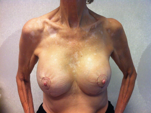 The breasts were prepped and draped and the left inframammary scar was excised, followed by a total capsulectomy and removal of the implant (275 gram, textured, round). It was not necessary to perform a dual plane conversion because of the already existing subpectoral position of the removed implant. After placement of wound drains new implants (360 gram, textured, round) were positioned. According to the preoperative drawings, the vertical amount of excess skin was now resected in the inframammary fold, tailor tacking the skin caudal to the nipple. Subsequently, the pinpoint marked area was de-epithelialised, tailor tacking the horizontal and periareolar skin excess (Figure 3).