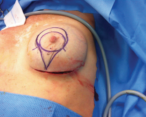 Preoperatively the amount of excess periareolar and inframammary skin was preliminary marked according to the pinpoint design (Figure 2b).