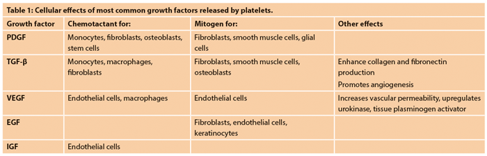 The effects of the first four of these are most well described (Table 1), but they are chemoattractant and mitogenic for a number of cells important to wound healing. Finally, of the proteins found in the plasma, fibrinogen plays a key part in wound response. The three dimensional fibrin mesh network formed after the conversion of fibrinogen to fibrin provides a substrate for growth factor binding as well as cellular migration. Indeed, Kakudo et al. showed a significant mitogenic effect of activated platelet poor plasma on adipose derived stem cells as well as dermal fibroblasts [1].